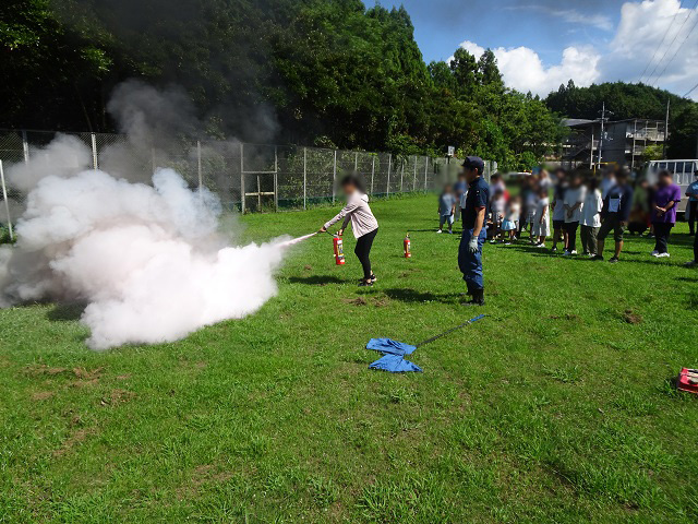 火事ってこわいよね! 10(日)、年2回開催している総合防災訓練の1回目を実施いたしました。当日は、通常の避難訓練を実施した後、天理教消防掛の団員の皆さまにご協力頂き、実物の消火器と水消火器を使用した消火体験も実施しました。おそるおそる消火器を使用する児童、慣れた手つきで使用する児童などさまざまでしたが、使用の仕方や火の勢いを学ぶとても良い機会となりました。いざという時の備えもそうですが、先ずは起こさないように注意していきたいと思います。