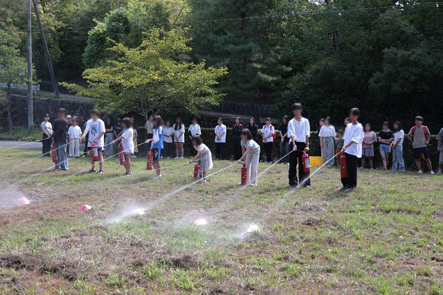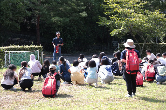 防災意識を高めよう! 7(日)AM、火事を知らせるサイレンが鳴ると、口に布を当て、一斉に運動場へ避難を行うみんなの姿がありました。毎月実施している訓練のおかげもあり、避難はとてもスムーズに行える様になりました。今回は、いつもの避難訓練に加え、消防士の方に来ていただき、消火器の基本的な使い方の指導を受けた後、水消火器を使った消火訓練を行いました。身近にある消火器の場所を覚えておいたり、その使用方法を知っておくことは、もしもの時の大きな備えになります。みんなしっかりと学ぶことができましたネ。